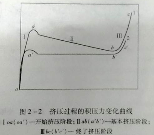 由于擠壓墊、擠壓筒對金屬的冷卻作用,金屬的溫度降低,變形抗力增大,強烈的摩擦作用使擠壓力迅速上升。